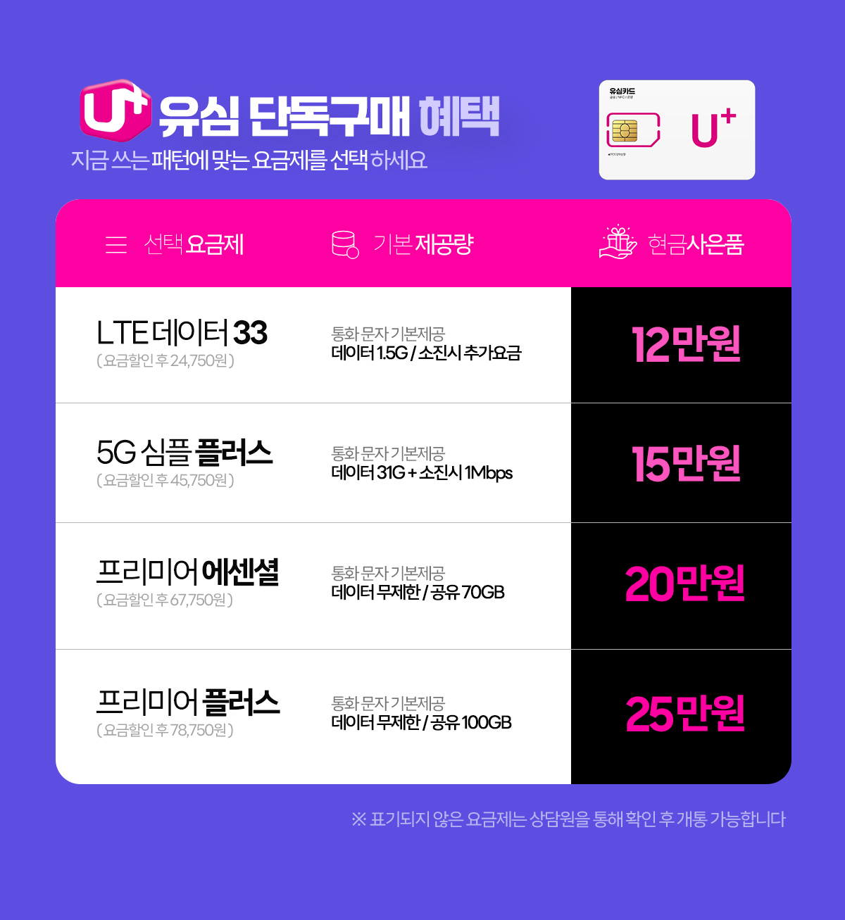 유심을 개통하신 후 기존폰, 자급제폰, 중고폰, 해외 직구 휴대폰에 유심을 넣어서 바로 사용할 수 있다. 일반적으로 단말기와 함께 유심을 개통하는 방식이었지만 요즘은 단말기의 수명이 길어지면서 유심만 개통해서 기존 단말기를 이용하는 경우가 많이 늘고 있다. 타 통신사로 번호이동하면서 유심만 개통해서 기존 폰을 재사용하는 경우 공시지원금은 받을 수 없지만 선택약정할인 혜택과 현금 사은품을 받을 수 있어서 이용자가 점점 늘어나고 있다. 폰슐랭샵, 엘지티샵에서 구입하는 경우 최저 5만 원, 최대 25만 원까지 현금 사은품을 받을 수 있다. 매장 방문 없이 쉽고 편리하게 유심칩 신청하고 사은품 받아보세요.